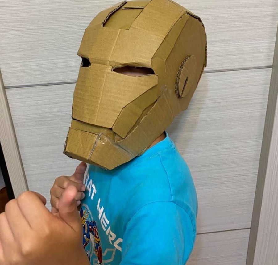因為疫情,不上市場、少去賣場,所以網購商品,有著許多箱子,此時媽媽們用手機的line軟體,相約視訊,媽媽們一面聊天一面帶著孩子與熟悉的夥伴,大家在不同的空間,但同時間用紙箱做出喜愛的東西。還可以做出三D立體頭盔,這樣紮紮實實的做了大半天,孩子們不吵不鬧,也不想休息,做完還很有成就感,之後在家可以玩變裝,如果防疫順利,聖誕節也可以派上用場。(照片瑞華媽、梅寶媽提供)