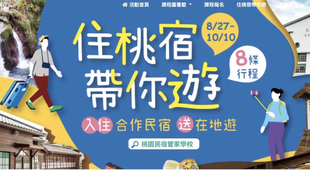桃園市政府觀光旅遊局為鼓勵民眾入住桃園民宿深刻感受桃園文化風情,特別推出「住桃宿帶你遊」活動,以四大民宿聚落(拉拉山、小烏來、大溪、龍潭區)為核心,開發八大特色行程,自8/27入住全市合作民宿,就可以免費參加,方案內容包括車資、餐食、體驗等,市價千元以上,限額1,500名額,先住先贏,額滿為止。