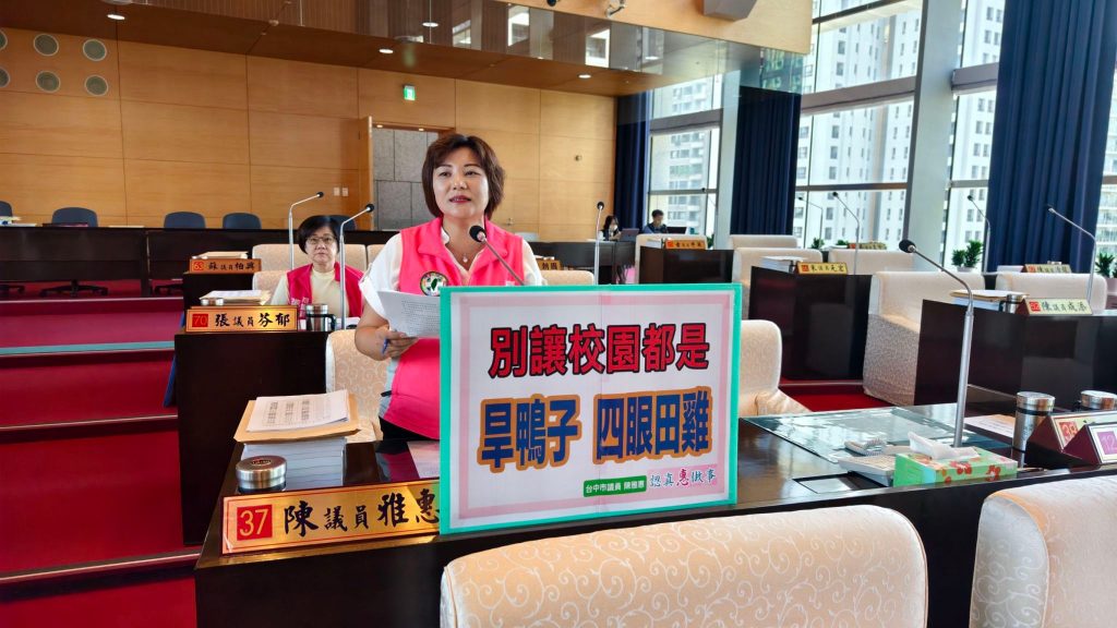 台灣是海洋國家,但中市學校有開游泳課程僅6成多,目前仍有近百校未開,另數位教學普及,學童近視情形日益嚴重,市議員陳雅惠29日在教育文化質詢中要求教育局重視這些問題,全面推動游泳課及鼓勵教師課程戶外化,不要讓校園滿是「旱鴨子及四眼田雞」。陳雅惠及市議員蕭隆澤也在議事堂抽問官員,結果僅約半數多的官員會游泳。