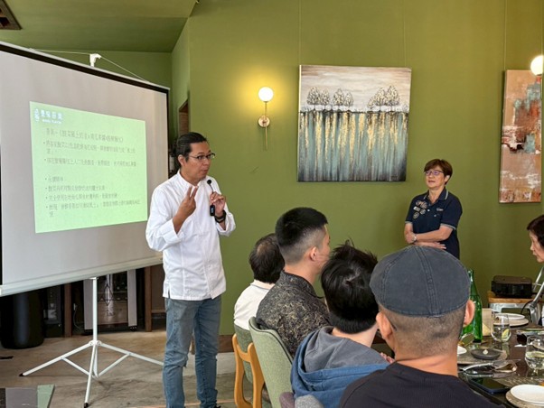 活動中,張皓福主廚以「綠星主廚的永續餐桌」為題,展示如何將苗栗客家風土轉化為國際級永續料理。他運用酸菜、梅乾菜、柿乾及貓裏紅茶等在地食材,設計出四道兼具創意與惜食理念的輕食料理,並強調:「綠色餐飲不只是使用當地食材,更是對土地最深的尊重。」與會主廚及餐廳代表針對食材規格、供應穩定性與品牌共創議題熱烈交流,現場氣氛熱絡,開啟跨縣市廚房與產地的永續對話。