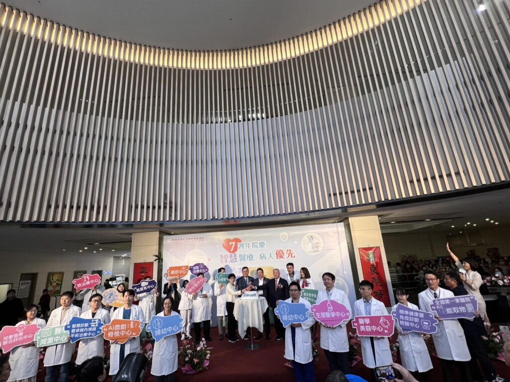 中醫大新竹附醫舉辦七周年院慶,以「智慧醫療,病人優先」為主題,新竹縣長楊文科率領縣府團隊,以及院長陳自諒、前縣長邱鏡淳、健保署北區業務組長張温温及議員,鄉鎮市長,醫界,學界、企業界,法界等貴賓共同出席,一起切蛋糕慶生。