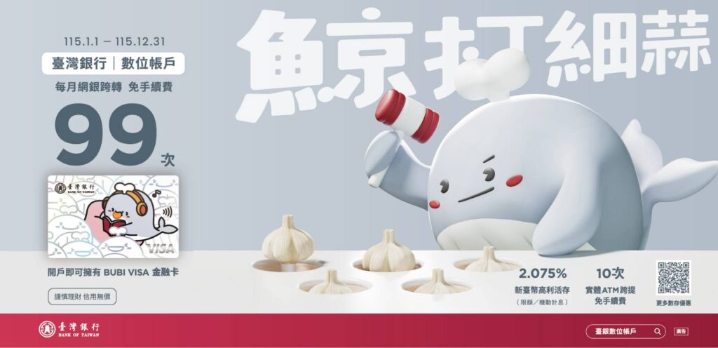 2. 「115年度數存優惠」:新臺幣2.075%高利活存+每月99次網銀跨轉免手續費優惠等全年度優惠方案。