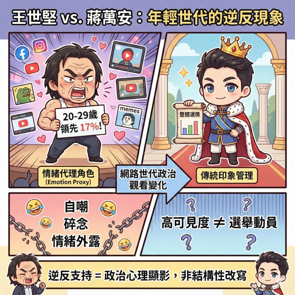 這也是為什麼在年輕世代中,王世堅更像一種「政治型偶像」。偶像不必完美,但必須可親、可共鳴、可被共創。他的形象並非建立在政策權威,而是建立在情緒代理之上:他替觀眾把那些對政治的不耐、憤怒與自嘲說出來。這種表演,並不等同於認同他的全部立場,卻足以在民調中形成短期的支持逆反。