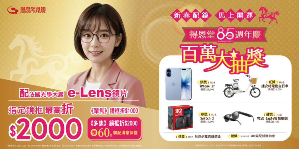 嶄新的一年開始,好視鄰居得恩堂眼鏡提醒大家要記得定期做視力健康檢查,若感覺看東西沒有以前清楚,就快到得恩堂做精準驗配,換一副新眼鏡,好視馬上來!2026年第一件好事,得恩堂眼鏡歡慶85週年!立馬獻上百萬感恩大禮包分享給大家!現在到得恩堂配鏡就可參加百萬大抽獎,獎項超豐富有機會獲得 iPhone17、捷安特電動自行車、Nintendo Switch 2、VIVE Eagle智慧眼鏡、易遊網萬元禮券 等大獎!配個眼鏡就有機會順便把這些大家最想要的新年禮物帶回家,這樣的好事只在得恩堂喔!