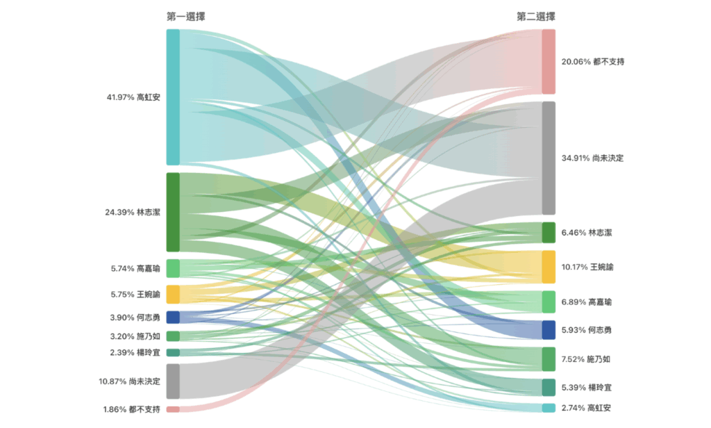 整體而言,高虹安以41.96%第一選擇支持度大幅領先,但可擴張空間僅2.74%,顯示支持者結構已近飽和。在民進黨陣營中,林志潔目前暫時領先,不過仍與高虹安有一段差距,而王婉諭雖然首選僅5.74%,但第二選擇比例達10.16%(最高),顯示選民潛在對其有較高的接受度。