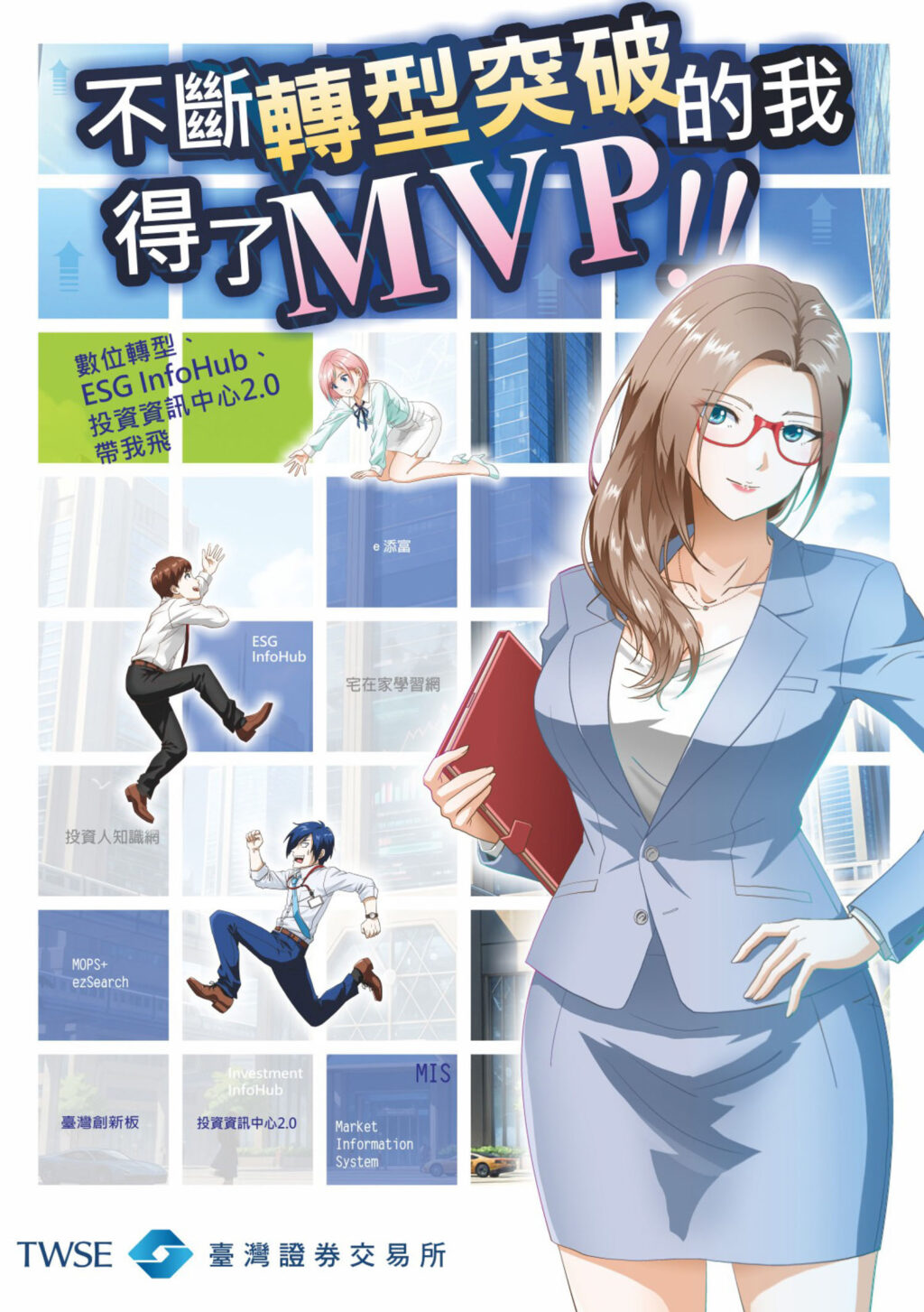 一向深受年輕人族群喜愛的證交所證券知識宣導漫畫,推出最新力作《不斷轉型突破的我得了MVP!!》,本次作品以職場青年為主角,從第一人稱視角出發,描繪主角在面臨工作挑戰與人生轉折之際,透過持續學習與自我精進,逐步突破瓶頸、實現成長的歷程。故事結合真實職場情境,將看似複雜的金融知識轉化為貼近日常的情節,引導讀者隨著主角的成長歷程,建立正確的投資觀念與風險意識。