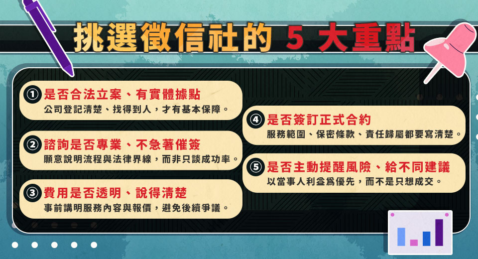 第四,委託過程是否透過正式合約進行,並清楚載明服務範圍、保密條款與責任歸屬,關係到雙方權益的保障。最後,也可從業者是否主動提醒風險、提供不同處理建議,來判斷其是否以當事人利益為出發點,而非單純追求成交。