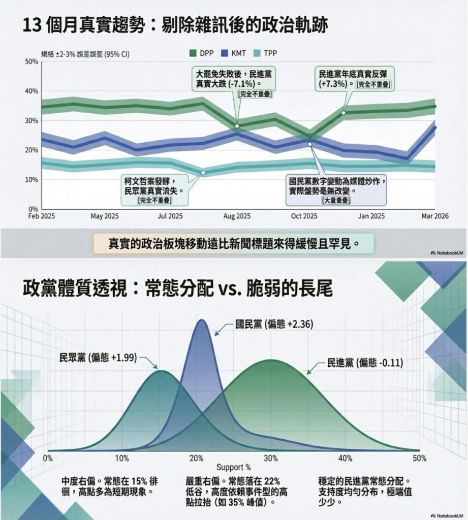回歸校正後的長期趨勢揭示了截然不同的面貌。國民黨的偏態係數高達正 2.36,峰態達 4.75,呈現嚴重的右偏分布:意即其支持度長期集中在低點,只有在特定外部事件刺激下才短暫衝高。校正後顯示,國民黨的真實底牌約在 20 至 22% 之間,標準差達 3.87%,是三黨中波動最大的一個,顯示其民意基礎高度依賴議題驅動,而非自主性的結構支撐。