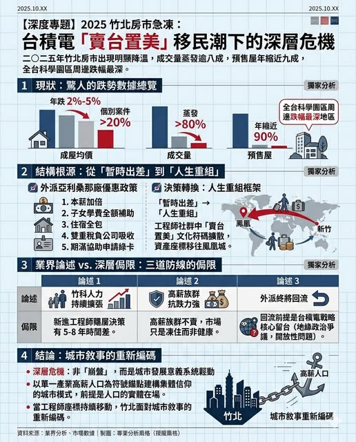 二○二五年,竹北某個社群媒體頁面上,一則貼文悄悄傳開:「屋主台積電工程師,長期派駐美國,誠售自住大樓,低於市價出售。」按讚的人不多,但轉發的人知道,那不是個案。