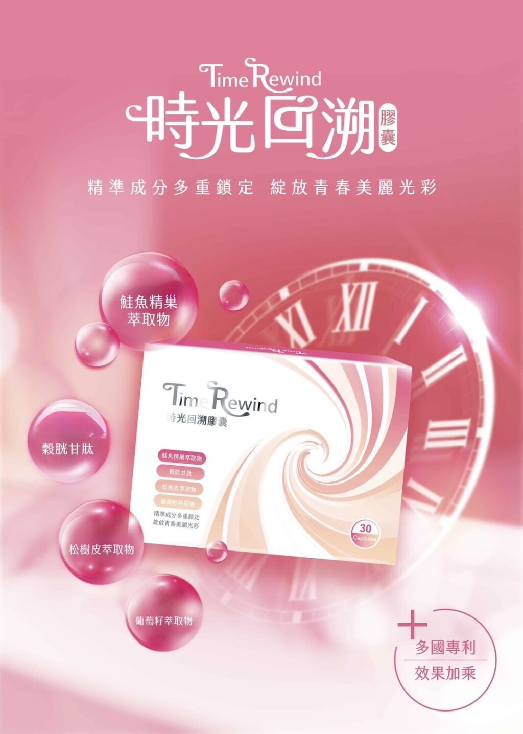 「時光回溯膠囊」採用多重複方設計,選用多項市場關注的多國專利營養成分,包括鮭魚精巢萃取物(含核酸 DNA-Na)、穀胱甘肽、松樹皮與葡萄籽萃取等,透過不同來源的植化素與營養元素組合,作為日常補充的一環。
