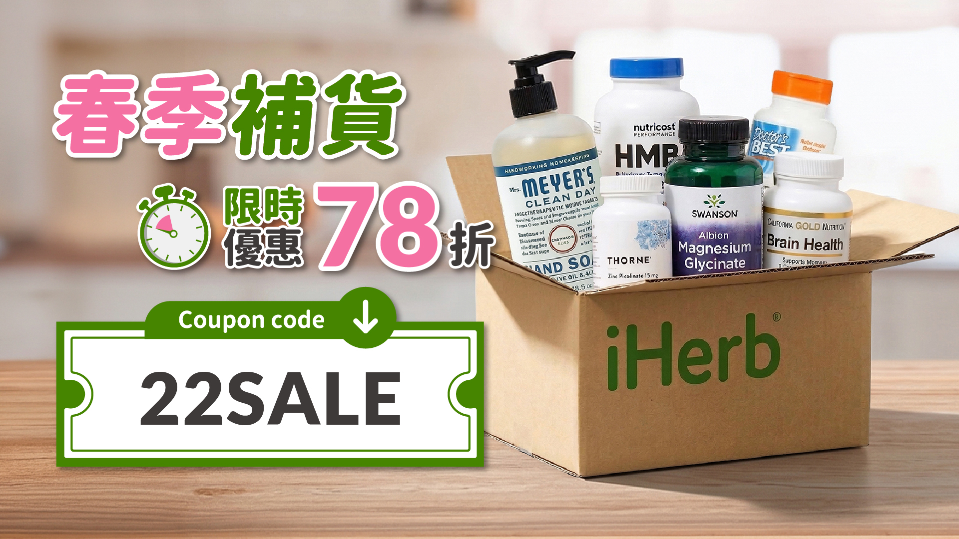 iHerb 表示,希望透過多元健康商品與跨境直送服務,讓消費者在換季時節也能輕鬆補充所需營養。為了感謝台灣消費者長年支持,iHerb 於 2026 年春季期間,特別推出專屬台灣消費者的超值優惠:4/10 至 4/24 期間,結帳輸入折扣碼「22SALE」,即可享 78 折優惠! 把握春季補給時機,為日常生活注入健康能量。