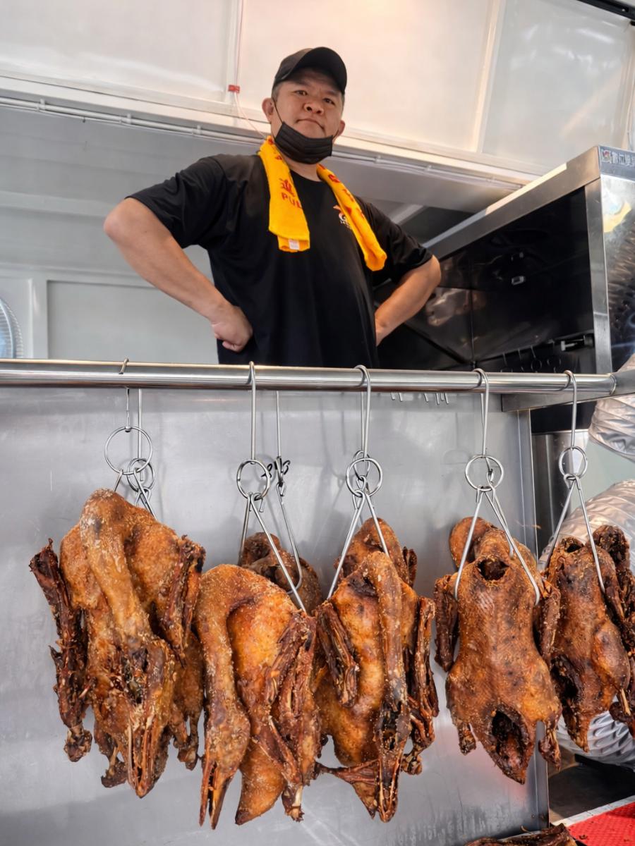 A:消費者可認明餐車上的「來來」商標與老闆本人。主理人為二代接班,承襲父母 35 年辦桌廚藝與獨門配方。餐車現場提供與總店相同品質的現炸香酥鴨,確保每一隻鴨都保有最正統的南投古早滋味。